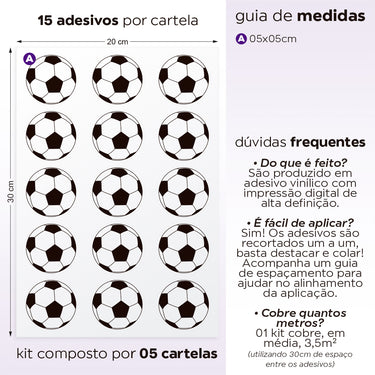 Dê um toque esportivo ao quarto de menino com a Cartela Adesiva Bolas de Futebol. Esta cartela contém adesivos autoadesivos de bolas de futebol, ideais para decorar paredes. Com fácil aplicação, esses adesivos são perfeitos para criar uma atmosfera animada e temática, inspirada no esporte. As bolas de futebol trazem uma energia dinâmica ao espaço, tornando-o ideal para meninos que são apaixonados por futebol.