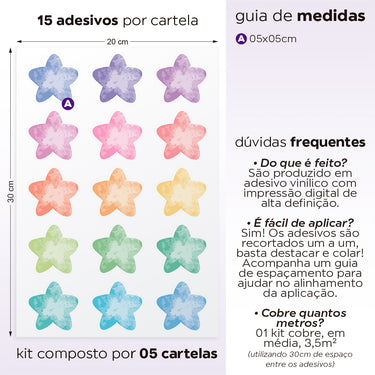 Traga um toque mágico ao quarto infantil com a Cartela Adesiva Estrelas Aquarelas. Esta cartela contém adesivos de estrelas pintadas em estilo aquarela, perfeitos para decorar paredes. Com fácil aplicação, esses adesivos criam uma atmosfera encantadora e sonhadora. As estrelas em tons suaves e vibrantes adicionam uma sensação de fantasia e brilho, tornando o ambiente mais acolhedor e inspirador para as crianças.
