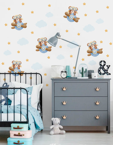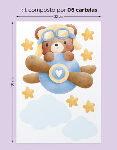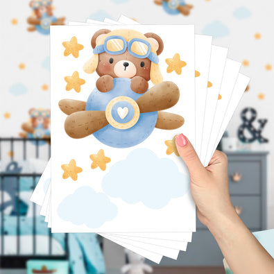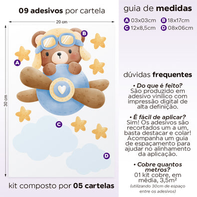 Decore o quarto de menino com a Cartela Adesiva Ursinho Aviador Azul. Esta cartela contém adesivos autoadesivos de ursinhos aviadores em tons de azul, ideais para aplicar em paredes. Com fácil aplicação, esses adesivos são perfeitos para criar um ambiente lúdico e aventureiro. Os ursinhos aviadores, com seus aviõezinhos e detalhes encantadores, trazem uma atmosfera de alegria e exploração, tornando o espaço ideal para inspirar sonhos de grandes aventuras.