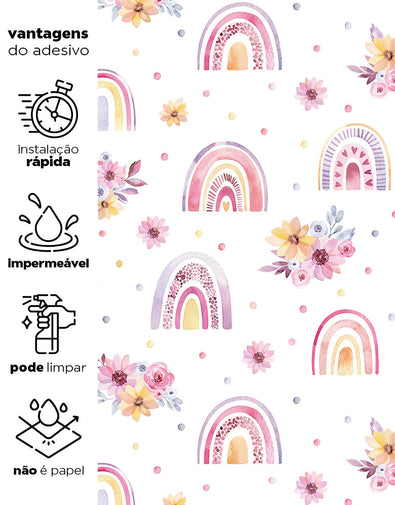 Crie um ambiente estiloso com o Papel de Parede Adesivo Arco Íris Boho. Lavável e fácil de aplicar, ele é perfeito para quartos infantis, proporcionando um visual moderno e colorido.