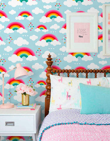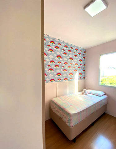 Crie um ambiente encantador com o Papel de Parede Adesivo Arco-Íris E Nuvens. Lavável e fácil de aplicar, ele é perfeito para quartos infantis, proporcionando um visual doce e alegre.