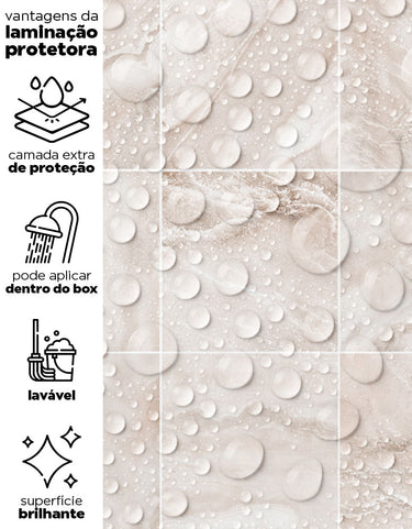Nossos adesivos são laváveis e incluem linhas especiais para áreas úmidas, como box, pias, pisos, entre outros. Para locais com contato frequente com água ou que demandam limpezas constantes, sugerimos a aplicação da película protetora. Ela proporciona um acabamento brilhoso e pode ser facilmente higienizada com pano úmido e sabão neutro.