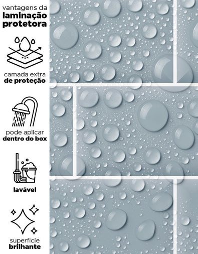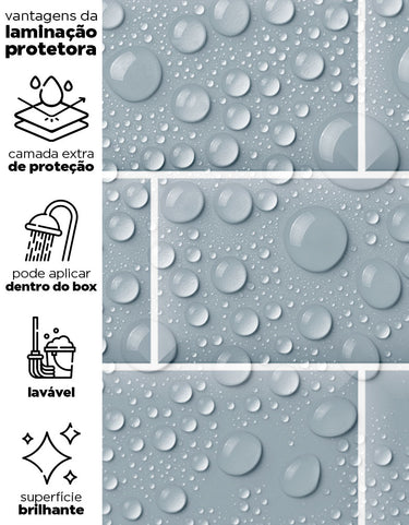 Nossos adesivos são laváveis e incluem linhas especiais para áreas úmidas, como box, pias, pisos, entre outros. Para locais com contato frequente com água ou que demandam limpezas constantes, sugerimos a aplicação da película protetora. Ela proporciona um acabamento brilhoso e pode ser facilmente higienizada com pano úmido e sabão neutro.