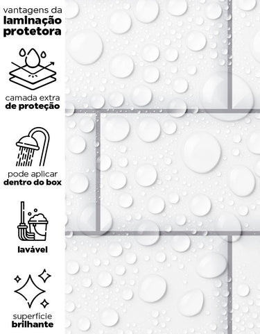 Nossos adesivos são laváveis e incluem linhas especiais para áreas úmidas, como box, pias, pisos, entre outros. Para locais com contato frequente com água ou que demandam limpezas constantes, sugerimos a aplicação da película protetora. Ela proporciona um acabamento brilhoso e pode ser facilmente higienizada com pano úmido e sabão neutro.