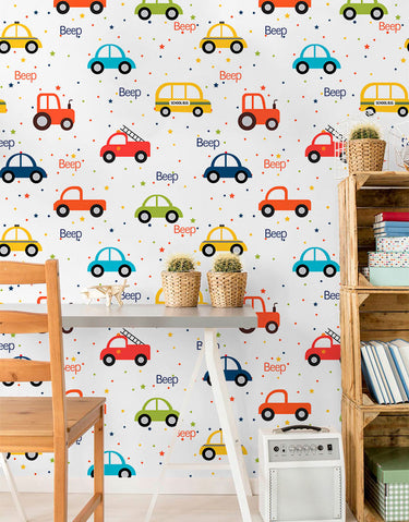 Crie um ambiente divertido com o Papel de Parede Adesivo Carrinhos Beep Beep. Lavável e fácil de aplicar, ele é perfeito para quartos infantis, proporcionando um visual alegre e moderno.