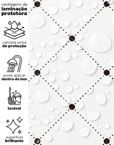 Nossos adesivos são laváveis e incluem linhas especiais para áreas úmidas, como box, pias, pisos, entre outros. Para locais com contato frequente com água ou que demandam limpezas constantes, sugerimos a aplicação da película protetora. Ela proporciona um acabamento brilhoso e pode ser facilmente higienizada com pano úmido e sabão neutro.