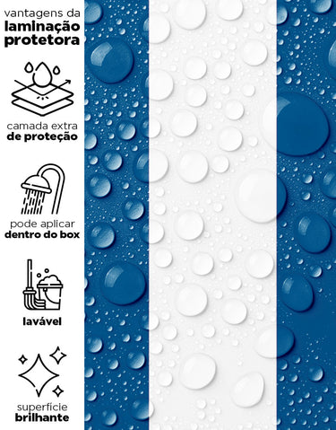 Nossos adesivos são laváveis e incluem linhas especiais para áreas úmidas, como box, pias, pisos, entre outros. Para locais com contato frequente com água ou que demandam limpezas constantes, sugerimos a aplicação da película protetora. Ela proporciona um acabamento brilhoso e pode ser facilmente higienizada com pano úmido e sabão neutro.