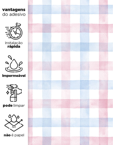 Com uma combinação delicada de azul e rosa em efeito aquarelado, esse xadrez vichy traz um toque suave e acolhedor para qualquer ambiente. Ideal para quartos infantis, salas e cantinhos especiais, deixando a decoração leve e charmosa!