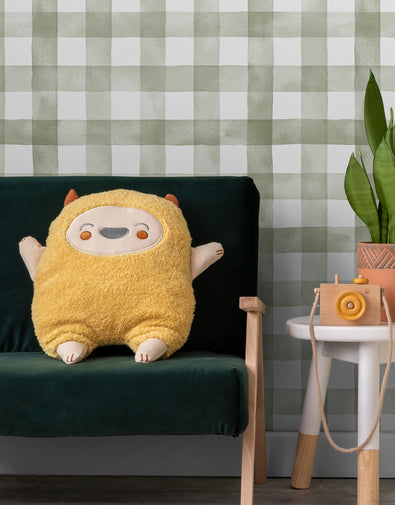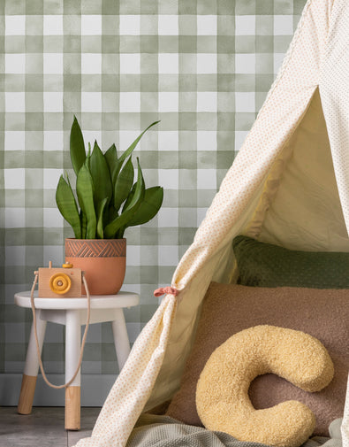 Renove seu ambiente com charme e sofisticação! Com um delicado efeito aquarelado, este papel de parede adesivo combina o clássico xadrez vichy em tons suaves de oliva, perfeito para quartos infantis, salas e diversos espaços.