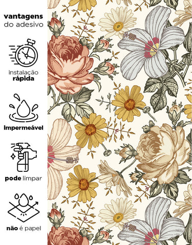 Crie um ambiente vintage com o Papel de Parede Autocolante Floral Vintage. Lavável e fácil de aplicar, ele é perfeito para qualquer espaço, proporcionando um visual encantador e nostálgico.