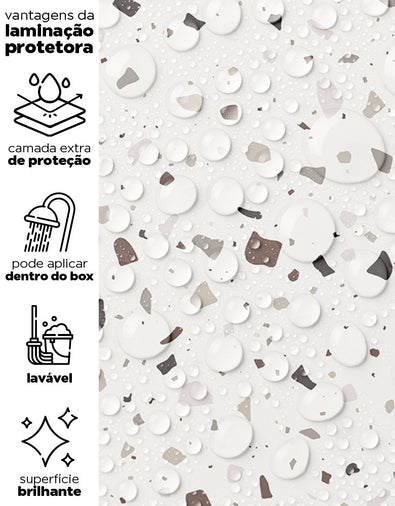 Nossos adesivos são laváveis e incluem linhas especiais para áreas úmidas, como box, pias, pisos, entre outros. Para locais com contato frequente com água ou que demandam limpezas constantes, sugerimos a aplicação da película protetora. Ela proporciona um acabamento brilhoso e pode ser facilmente higienizada com pano úmido e sabão neutro.