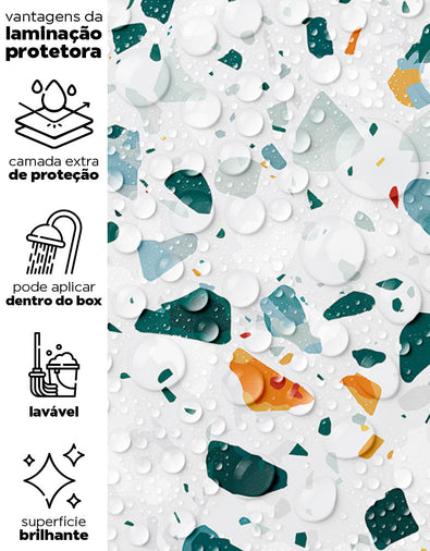 Nossos adesivos são laváveis e incluem linhas especiais para áreas úmidas, como box, pias, pisos, entre outros. Para locais com contato frequente com água ou que demandam limpezas constantes, sugerimos a aplicação da película protetora. Ela proporciona um acabamento brilhoso e pode ser facilmente higienizada com pano úmido e sabão neutro.